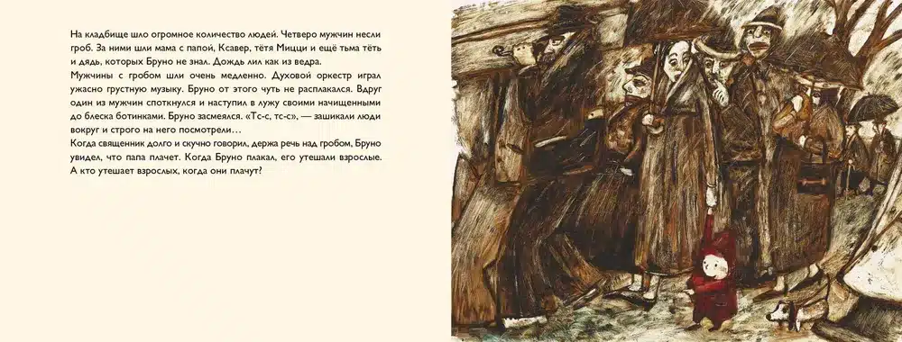 Бруно очень любит своего дедушку. А теперь его нет… Брат Бруно, Ксавер, утверждает, что он на кладбище, а папа говорит — на небесах. Но что тут правда? Ксавер так много врёт, что Бруно не знает, можно ли ему поверить в этот раз. А родители постоянно повторяют: «Этого ты пока не поймёшь»… Поначалу, что бы Бруно ни делал, он чувствует глухую боль в груди. Как будто у него маленькая дырка в груди под свитером. Но постепенно она затягивается. Каждый вечер перед тем, как лечь спать, Бруно смотрит на дедушкину фотографию и разговаривает с ним. «Я тебя не забуду», — обещает он дедушке. И кажется, что тот улыбается ему издалека. Книга «А дедушка в костюме?» в 1998 году была отмечена Немецкой детской литературной премией и Немецким фондом искусств. Она переведена на французский, японский, корейский и китайский языки. «Открытый диалог» — самая непростая книжная серия издательства «КомпасГид».