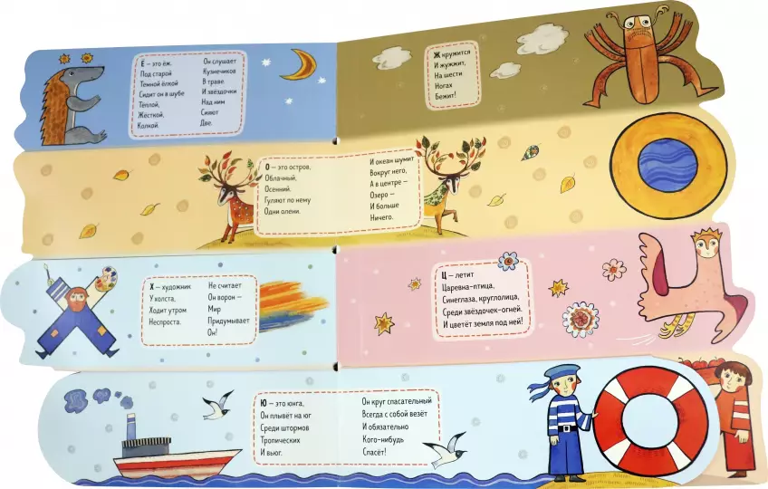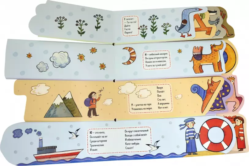 Каждая буква нарисована в виде зверя, птицы, забавного человечка или сказочного существа, и у каждой – своя картонная страничка, которую легко найти и открыть. Фигурные странички выглядывают одна из-за другой и приглашают скорее познакомиться и подружиться с их удивительными обитателями.
