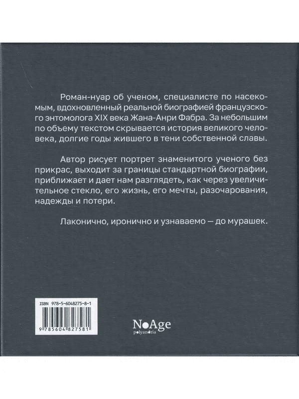 Роман-нуар об ученом, специалисте по насекомым, вдохновленный реальной биографией французского энтомолога XIX века Жана-Анри Фабра. За небольшим по объему текстом скрывается история великого человека, долгие годы жившего в тени собственной славы.