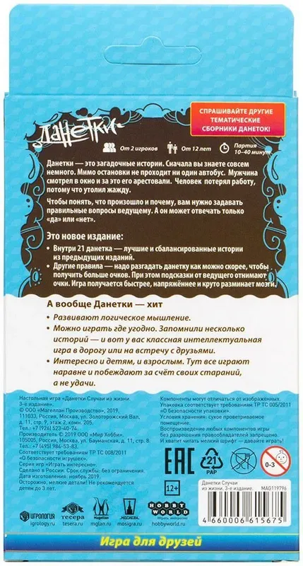 Чтобы понять, что произошло и почему, вам нужно задавать правильные вопросы ведущему. А он может отвечать только “да” или “нет”. За пару-тройку данеток вы почувствуете себя настоящим детективом, который на ходу распутывает сложные головоломки!