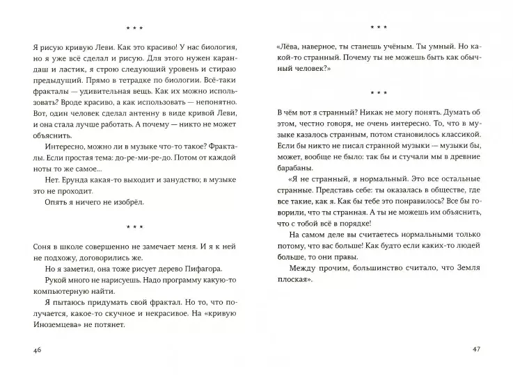 “Я не странный, я нормальный. Это все остальные странные. На самом деле вы считаетесь нормальными только потому, что вас больше! Как будто если каких-то людей больше, то они правы. Между прочим, большинство считало, что Земля плоская”.