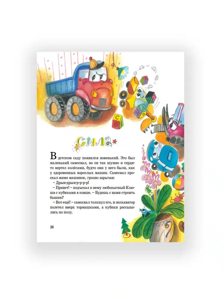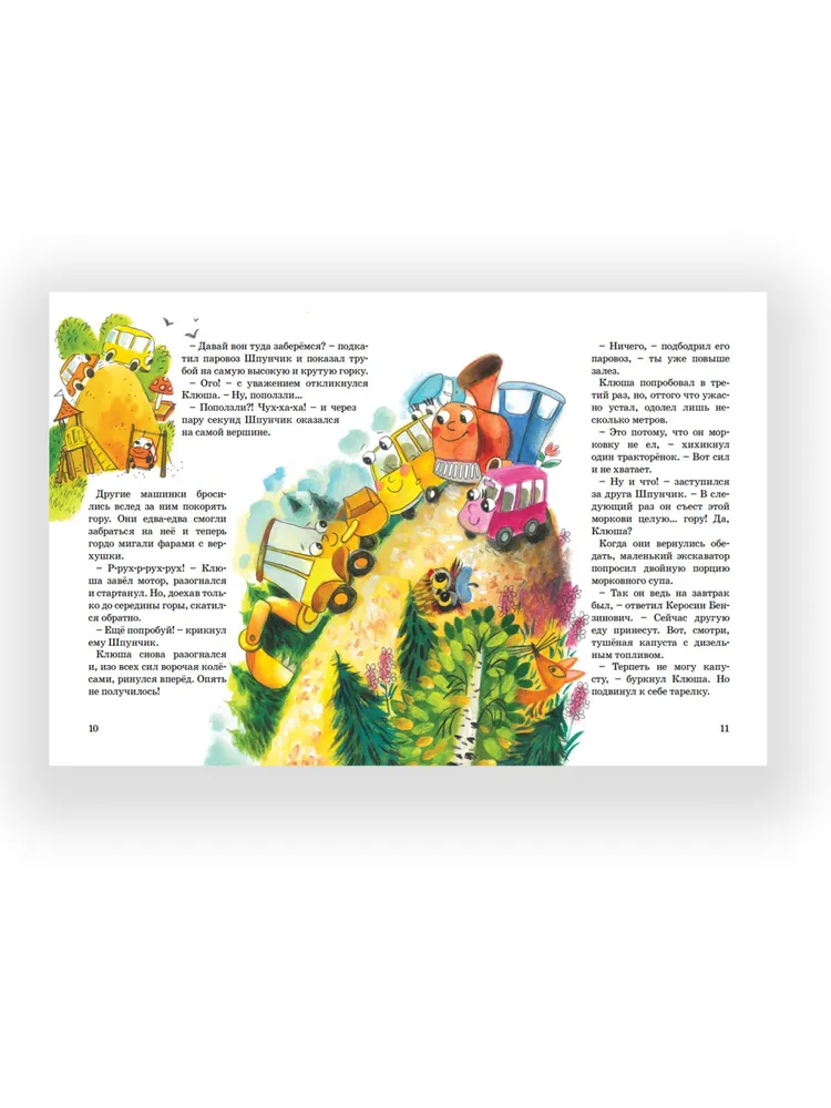 Вот и маленький экскаватор Клюша впервые идёт в детский сад и робко въезжает в свою группу. Что его там ждёт? Вокруг сломя голову носятся ребята-машинки, а бульдозер-нянь Керосин Бензинович выглядит таким грозным! Вдруг они его обидят?