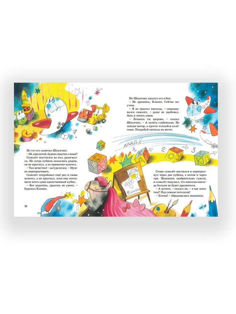 По счастью, на выручку Клюше приходит неугомонный паровозик Шпунчик, умеющий забираться на потолок и мечтающий водить скоростные поезда, когда вырастет. Он приглашает Клюшу присоединиться к общей игре, и вскоре тот заводит дружбу не только со Шпунчиком, но и с автомобильчиком Тобиком и другимиМалышами. Да и нянь Керосин Бензинович оказывается вовсе не грозным, а справедливым и внимательным.