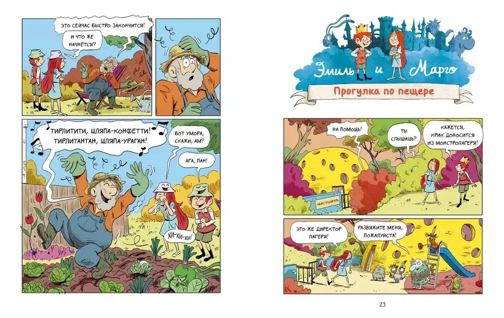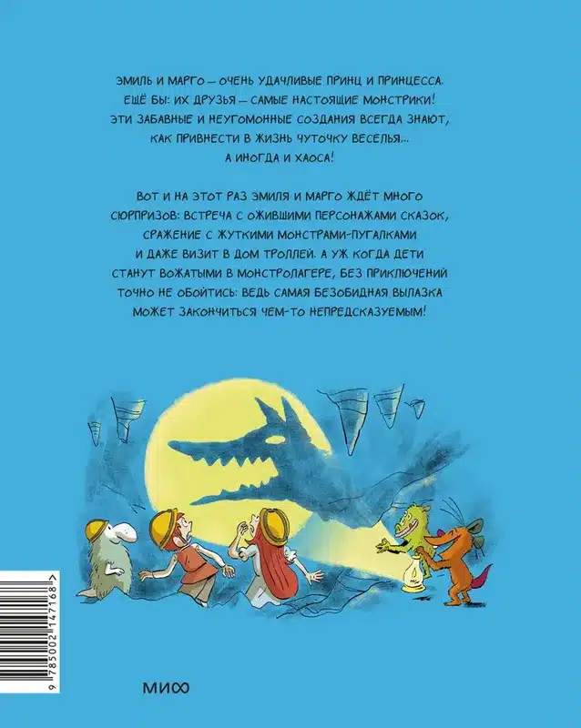 Тринадцатый том популярной серии комиксов для детей про Эмиля и Марго и их друзей-монстриков. Забавные и неугомонные создания всегда знают, как привнести в жизнь принца и принцессы чуточку веселья. А иногда и хаоса. Вот и на этот раз главных героев этой детской книги ждет много сюрпризов: встреча с ожившими персонажами сказок, сражение с жуткими монстрами-пугалками и даже визит в дом троллей. А уж когда дети станут вожатыми в монстролагере, без приключений точно не обойтись: ведь самая безобидная вылазка может закончиться чем-то непредсказуемым.