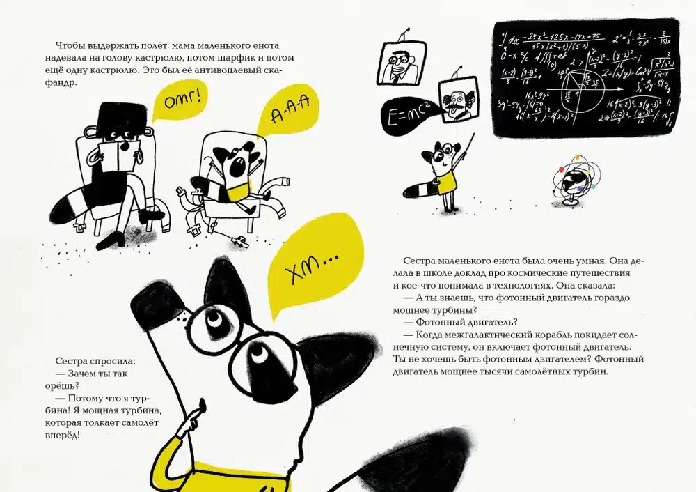 Жил-был маленький енот, который орал как турбина, устраивал бурю в ванной и покорял немыслимые высоты без страховки. Мама и папа страшно переживали за сына. Они громко охали и обещали сойти с ума. Хорошо, что у маленького енота была сестра. Она качала головой, вспоминала школьную физику и почти всегда находила гениальное решение.