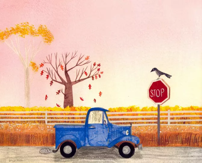 Напоминающие фольклорные мотивы строки стихотворения знакомят читателей с Голубым грузовичком и обитателями скотного двора, которых он встречает, пока едет по проселочным дорогам мимо своего сельского дома. Первая половина книги – очаровательная, приводящая в оцепенение симфония сигналов машины и звуков животных. Веселый текст имитирует прыгающий грузовик, а теплые иллюстрации в народном стиле дополняют картину. Начинается дождь, и в историю вступает подлый, напыщенный самосвал. Когда же самосвал попал в грязь и сигналит о помощи, никто его не слышит. Голубой грузовичок хочет помочь, но тоже застревает. И когда он кричит о помощи, животные бегут ему на выручку. Так самосвал узнает, что: