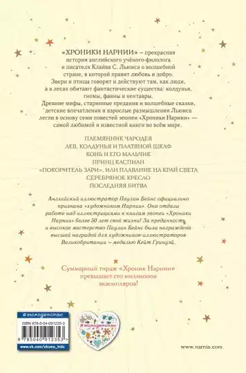 Древние мифы, старинные предания и волшебные сказки, детские впечатления и взрослые размышления английского писателя Клайва С.Льюиса легли в основу семи повестей эпопеи “Хроники Нарнии” – самой любимой и известной книги во всем мире. Книга оформлена цветными рисунками Паулин Бейнс, которая официально признана “художником Нарнии” и отдала работе над иллюстрациями к книгам эпопеи более 50 лет своей жизни.