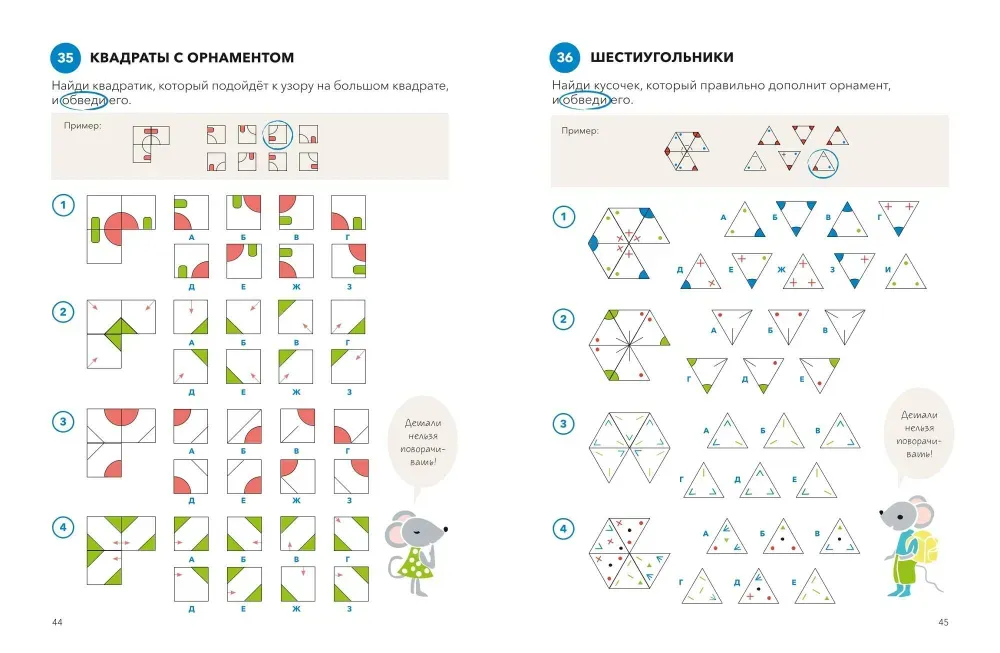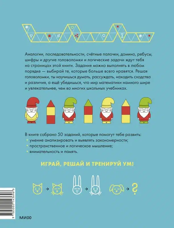 Аналогии, последовательности, орнаменты, геометрические фигуры, счетные палочки, домино, ребусы, кубики, шифры, графические примеры — все задания в сборнике не требуют вычислений. Выполнять их можно в любом порядке, выбирая те, которые больше всего нравятся.