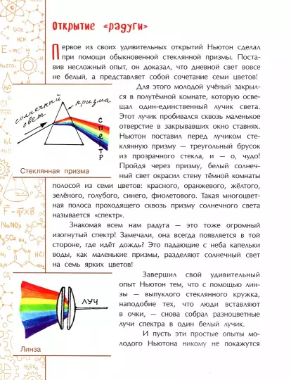 Белый цвет состоит на самом деле из семи цветов. Все тела во Вселенной взаимно притягивают друг друга. Эти удивительные открытия сделал сын простого английского фермера Исаак Ньютон. Он также сформулировал три главных закона механики, стал первым учёным, посвящённым в рыцари, и членом парламента.