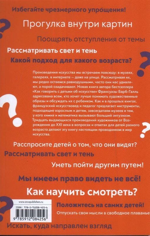 Произведения искусства мы встречаем повсюду; в музеях, галереях, в интернете – даже на улице. Рассматривая их. мы редко остаемся равнодушными, часто они нас удивляют, а порой озадачивают. Новая книга автора бестселлера “Как говорить с детьми об искусстве” Франсуазы Барб-Галль адресована всем, кто хочет лучше понимать художественные образы и обсуждать их с ребенком. Как и в прошлых книгах, французский искусствовед и педагог предлагает инструменты, подходящие взрослым и детям, завсегдатаям музеев и тем, у кого химия и математика вызывают больший энтузиазм. Тридцать выдающихся произведений художников от Возрождения до XXI века в вопросах и ответах для детей разного возраста делают эту книгу настоящим проводником в мир искусства.