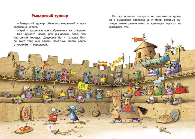 В Картонном городке жизнь бьёт ключом! Его обитатели весело проводят время, особенно дружное семейство Папмайеров. Вот уж кто всегда найдёт, чем себя занять, и не пропустит ни одного важного события, будь то авиационный парад, съёмки кинофильма или рыцарский турнир. Мышата Йоги и Берт Папмайеры даже приняли в нём участие. И совсем не важно, что кое-кто на этом турнире вместо рыцарского меча держал… обыкновенную швабру. Главное – кровожадный дракон был побеждён!