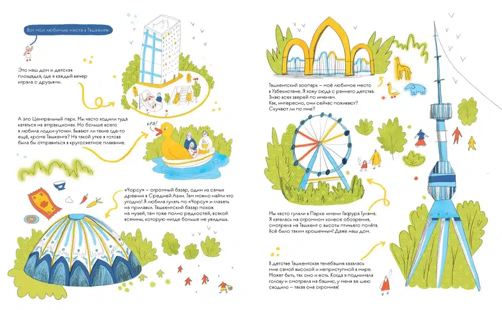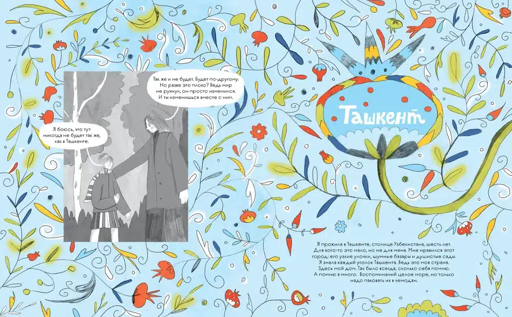 Воспоминания сплетаются в узор, в причудливый орнамент, за которым угадывается далёкая солнечная страна. Страна, из которой Аля уехала в шесть лет. Страна, где остались те, кто был ей дорог. Шумные базары и узкие улочки дружелюбного Ташкента сменили широкие проспекты серого города. И вот уже Але и её семье приходится обживать новый дом, покорять другую страну, осваивать незнакомый чёрно-белый мир, который пришёл на смену старому — расцвеченному яркими красками. Как жить тем, кто уезжает, и тем, кто остаётся? Как смотреть в будущее, если хочется вернуться в прошлое? И как научиться принимать новое, оставаясь самим собой?