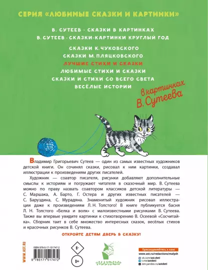 Художник – соавтор писателя, рисунки добавляют дополнительные смыслы к историям и погружают читателя в сказочный мир. В. Сутеева можно по праву назвать соавтором классиков детской литературы – С. Маршака, А. Барто, Г. Остера – и менее известных писателей – С. Баруздина, С. Мурадяна. Знаменитый художник рисовал иллюстрации даже к произведениям Л. Н. Толстого! В книге публикуется басня Л. Н. Толстого «Белка и волк» с мало известными рисунками В. Сутеева. Также вы впервые увидите картинки к стихотворению В. Осеевой «Сосчита-ка». Сборник таит в себе множество интересных сказок, весёлых стихов, красочных и неизвестных рисунков В. Сутеева.