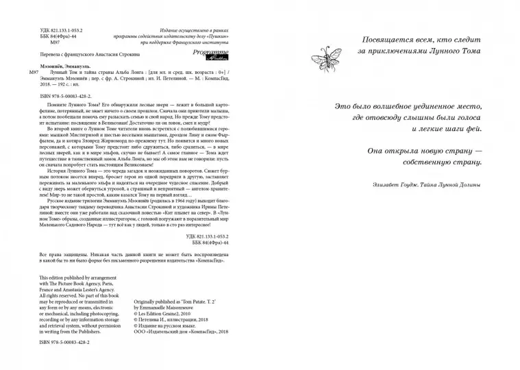 Русское издание трилогии Эммануэль Мэзоннёв (родилась в 1964 году) выходит благодаря творческому тандему переводчика Анастасии Строкиной и художника Ирины Петелиной: вместе они уже работали над сказочной повестью “Кит плывет на север”. В “Лунном Томе” образы, созданные иллюстратором, с головой погружают в поразительный мир Маленького Садового Народа – тут всё как у людей, только в сто раз интереснее!