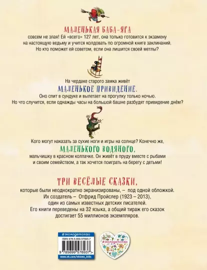 Отфрид Пройслер (1923-2013) – известный немецкий писатель. В Германии он чрезвычайно популярен и принадлежит к числу самых известных детских писателей. Наши читатели знают Пройслера именно по сказочным повестям “Маленькая Баба-Яга”, “Маленький Водяной” и “Маленькое Привидение”. Все три эти знаменитые сказки собраны в одной книге.