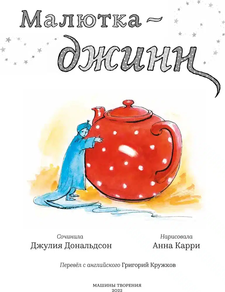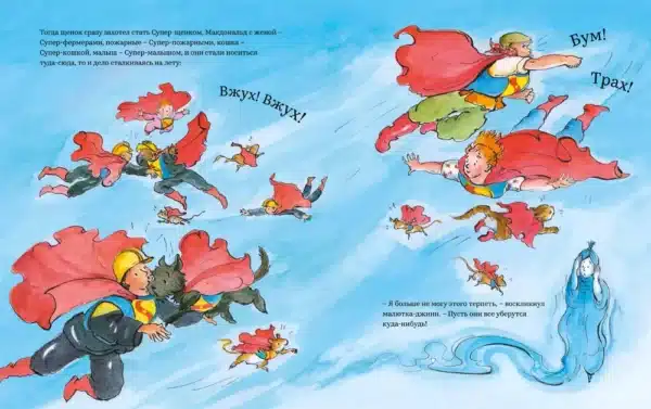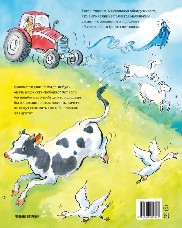 У старого Макдональда была ферма. «Очень много работы на ферме. Вот если б жену — она бы мне помогла», -мечтал старина Макдональд. Поэтому, когда он обнаруживает, что в его чайнике прячется маленький джинн, то первым делом просит у волшебника миссис Макдональд. Миссис Макдональд просит у джинна малыша, малыш просит щенка, который просит кошку, которая просит мышей. Мыши просят футбольный мяч и большой громкий свисток, и очень скоро на ферме становится невыносимо шумно и тесно. Сможет ли джинн когда-нибудь опять вздохнуть свободно? Вот если бы нашёлся кто-нибудь, кто исполнил бы его желание: ведь джинны ничего не могут пожелать для себя — только для других.