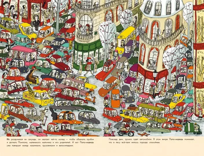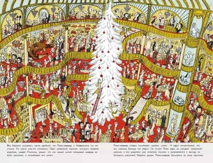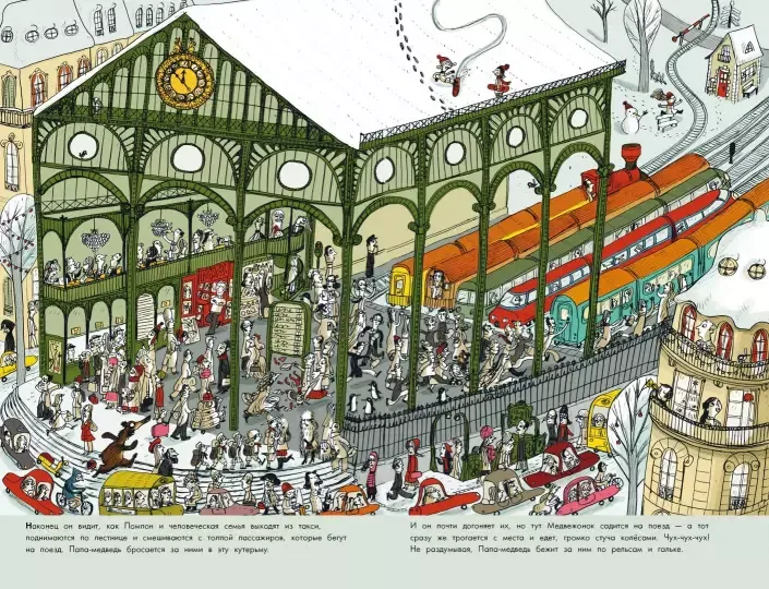 Папа и медвежонок Помпон долго искали, куда бы спрятаться от снегопада, – и нашли прекрасную просторную берлогу, где уже ютились сотни разноцветных медведей. А утром сын пропал: берлога оказалась магазином, и Помпона купил и унёс с собой какой-то мальчик! Не раздумывая ни минуты, папа-медведь бросается в погоню! Как же ему догнать медвежонка?!