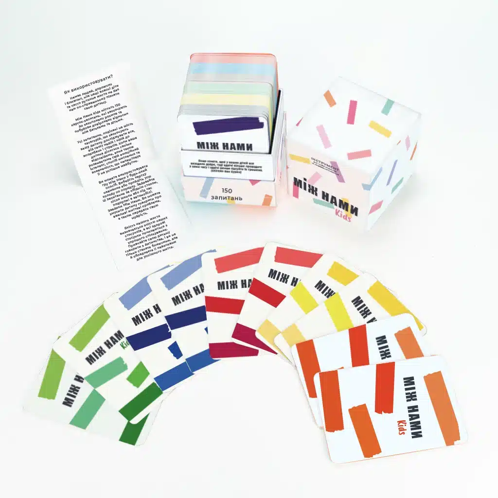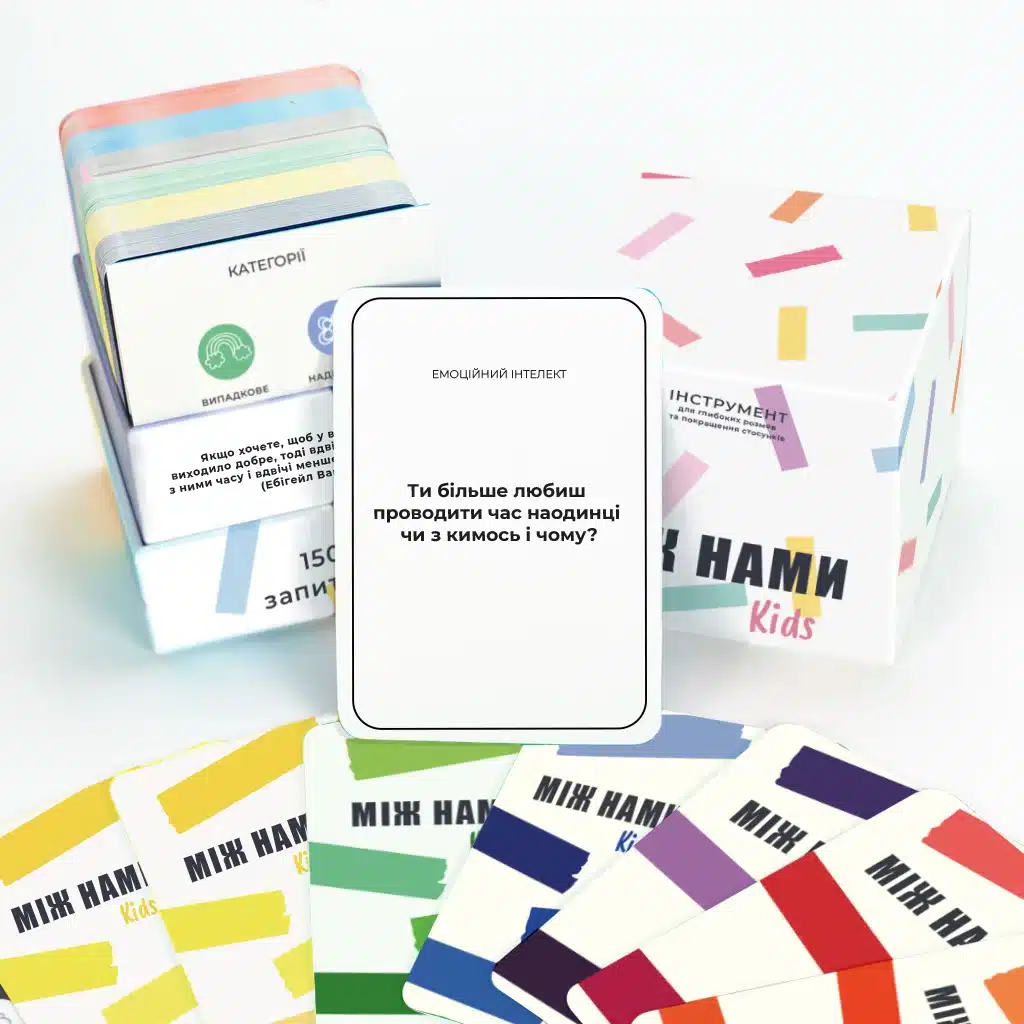 Між нами Kids – настільна гра, яка допоможе Вам краще зрозуміти свою дитину, розвинути її емоційний інтелект і допомогти стати впевненіше почуватися потрібним і цінним, зрозуміти себе краще і легше приймати поради.батьків. Розроблена, з метою передати цінні життєві уроки та зрозуміти, як Ваша дитина мислить.