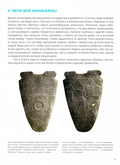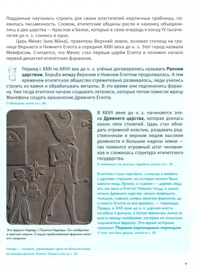В Египет сейчас поехать просто: сел на самолет – и через несколько часов перед тобой море, пирамиды и верблюды. А хочешь оказаться в Древнем Египте? Его цивилизация просуществовала более 40 столетий и оставила огромное наследие. Учёные смогли расшифровать египетские иероглифы и узнать, как строились гигантские пирамиды. Никаких верблюдов, представь, в Древнем Египте ещё не было. И если бы ты жил в Древнем Египте, под властью фараона, ты бы учился в “доме жизни”, носил парик, писал тростниковым пером на папирусе, играл бы в сенет, а не в домино, и ел бы руками! Интересно? Тогда вперед, в историю: бери скорее нашу энциклопедию с полки, читай, рассматривай иллюстрации и делись новыми знаниями и наблюдениями!