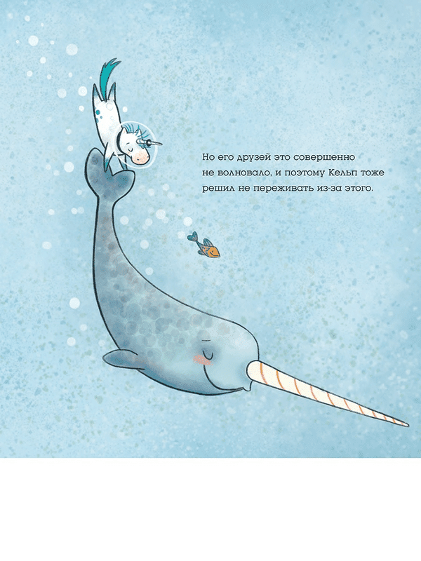 Кельп рос под водой и всегда думал, что он нарвал, как и все в его семье. Конечно, Кельп слегка отличался от них: его бивень был не таким большим, плавал он не так хорошо и совсем не любил пищу нарвалов. Однажды ночью сильное течение унесло Кельпа к суше. Там он увидел таинственного зверя, который выглядел точь-в-точь как он сам! Кельп узнал, что он, как и этот зверь, — единорог. Это открытие не давало ему покоя: он наземный нарвал или морской единорог? Сможет ли Кельп придумать, как объединить лучшие черты каждого из этих миров?