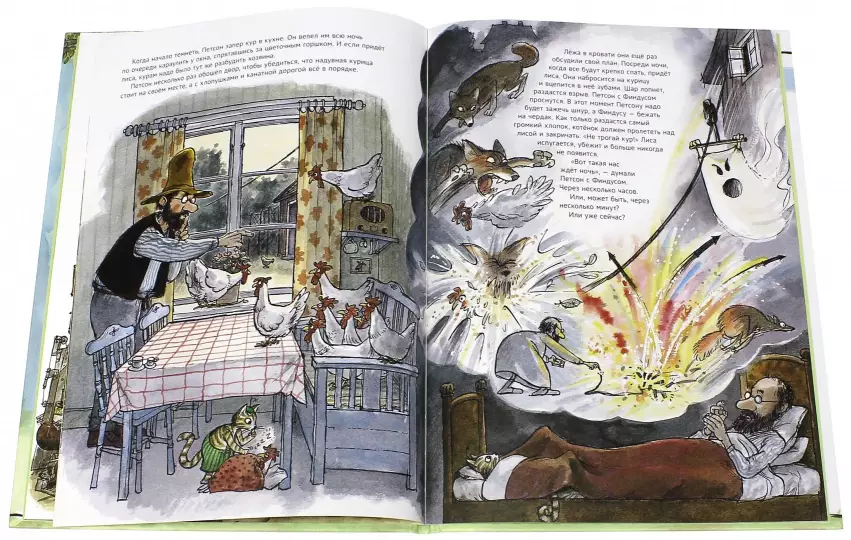 Петсон, его друг котенок Финдус и их куры мирно живут в маленькой шведской деревушке. Но однажды в деревне появилась лиса. И стала таскать кур. Сосед Густавсон решил пристрелить лису. О том, как Петсон и Финдус спасали кур от лисы, а лису от соседа, рассказывается в этой презабавной книжке.