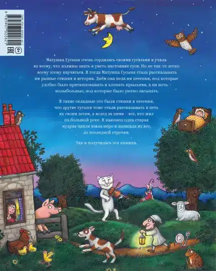 Но не так-то легко всему этому научиться. И тогда Матушка Гусыня стала рассказывать своим гусятам разные стишки и истории. Она развлекала их скороговорками и считалками. Днём она пела им песенки, под которые удобно было пританцовывать и хлопать крыльями, а на ночь – колыбельные, под которые было уютно засыпать.