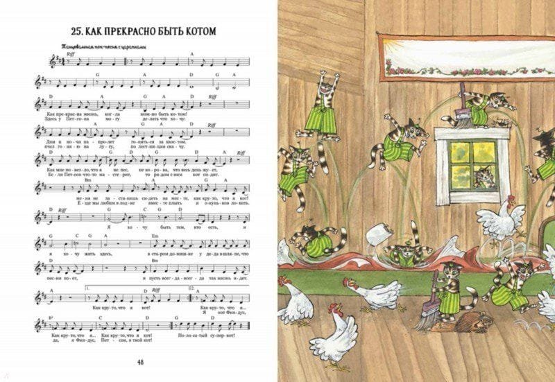 В книгу вошли двадцать пять песен с нотами по мотивам книг из популярной серии о старичке Петсоне и его котенке Финдусе. Эти песни можно не только разучить на гитаре или фортепьяно, но также послушать или скачать на музыкальных сервисах Apple Music, Google Play Music, Яндекс.Музыка, BOOM (ВКонтакте) и др.