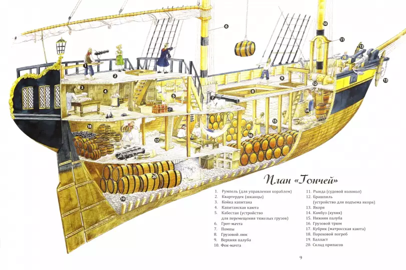 Мир моряков и пиратов оживил замечательный художник Крис Ридделл. Его детальные иллюстрации перенесут читателя на бриг “Гончая” и покажут жизнь моряков во всех подробностях. За книгу “Пиратский дневник” художник получил медаль Кейт Гринуэй, которую присуждают лучшим иллюстраторам детских книг.