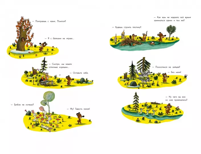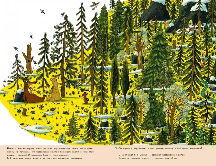 “Нарисуй что-нибудь в духе “Где Уолли?”, только с семейством кенгуру, попросила меня издатель. Я не люблю кенгуру – и нарисовал медведей. Уолли вымышленный – а мои истории правдивы и автобиографичны”, – говорит французский художник Бенжамен Шо, дважды номинант на премию Андерсена. Но лукавит: его истории – очаровательны! Рассматривать большие страницы с приключениями непоседливого медвежонка Помпона и находить всё новые детали хочется снова и снова.