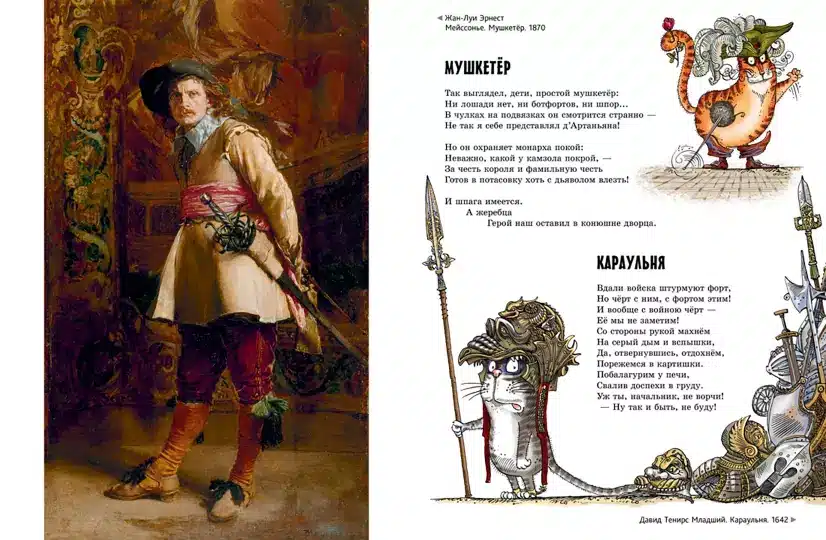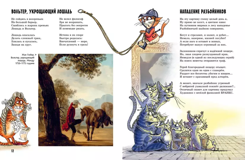 Представьте себе: вы гуляете по роскошному дворцу. Кругом мебель, обитая бархатом, старинные картины в золочёных рамах… А навстречу вам то и дело попадается кто-нибудь очень необычный: то настоящий мушкетёр, то пара оборванных цыганских детишек, а то и сам Александр Македонский! Думаете, такое возможно только во сне? А вот и нет — подобное запросто может произойти, если вам вздумается прогуляться по Эрмитажу. И уж если вашим экскурсоводом вызвался стать сам профессор АУ, прогулка обещает быть чрезвычайно увлекательной и по-настоящему захватывающей! Профессор с удовольствием поведает вам множество стихотворных историй о картинах и их создателях, а сопровождать вас будут знаменитые на весь мир эрмитажные коты, которых изобразила замечательная художница Елена Гозман.