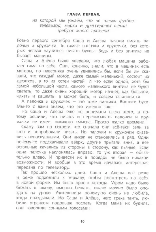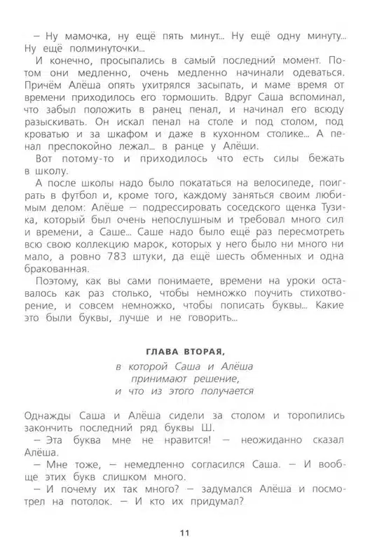 Саша и Алёша – родные братья, и не просто родные братья, а близнецы. Каждому из них ровно по семь лет, восемь месяцев и девять дней, и они очень похожи друг на друга. Всё лето, надев школьную форму, близнецы любовались своим отражением в зеркале и думали о том, что скоро, очень скоро у них начнётся новая жизнь. Но они совсем не догадывались, какие приключения их ожидают. Всё началось сразу после первого сентября, когда Саша и Алёша в первый раз пошли в школу. Теперь им приходилось подниматься рано по утрам, собирать портфели и делать уроки. И если с первыми двумя задачами они ещё как-то справлялись, то домашние задания были самой настоящей бедой. Конечно, попробуй тут усиди, когда эти настырные палочки-крючочки никак не хотят складываться в буквы! Лучше бы этих букв совсем не было!