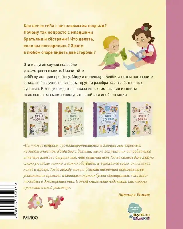 В книге вы найдёте ответы на эти и многие другие вопросы. Прочитайте ребёнку истории про Гошу, Миру и маленькую Бейби, а потом обсудите их, чтобы лучше понять друг друга и разобраться в собственных эмоциях и чувствах. В конце каждого рассказа есть комментарии и советы психологов, как лучше поставить в той или иной ситуации.