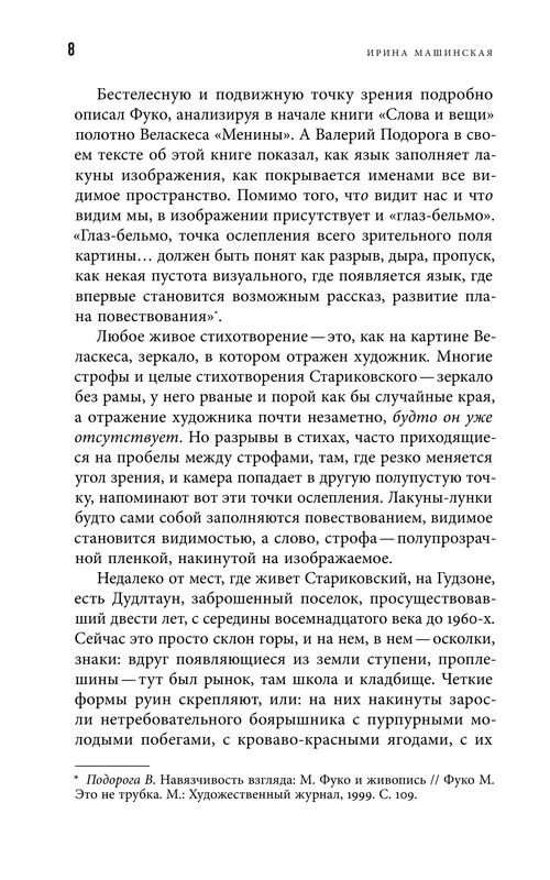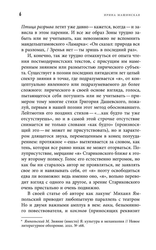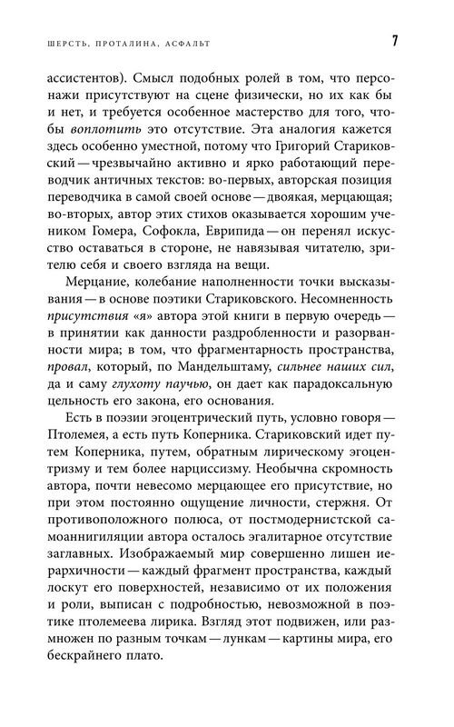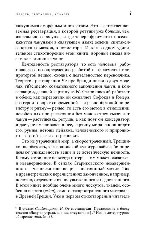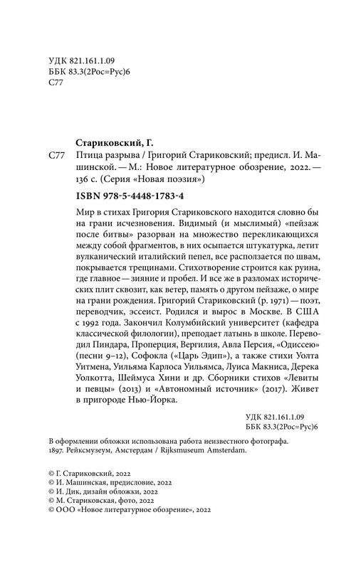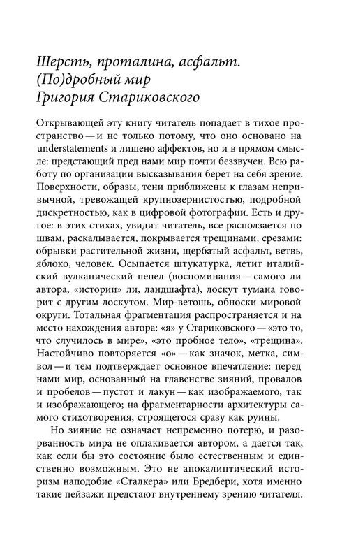 Мир в стихах Григория Стариковского находится словно бы на грани исчезновения. Видимый (и мыслимый) «пейзаж после битвы» разорван на множество перекликающихся между собой фрагментов, в них осыпается штукатурка, летит вулканический италийский пепел, все расползается по швам, покрывается трещинами. Стихотворение строится как руина, где главное — зияние и пробел. И все же в разломах исторических плит сквозит, как ветер, память о другом пейзаже, о мире на грани рождения. Григорий Стариковский (р. 1971) — поэт, переводчик, эссеист. Родился и вырос в Москве. В США с 1992 года. Закончил Колумбийский университет (кафедра классической филологии), преподает латынь в школе. Переводил Пиндара, Проперция, Вергилия, Авла Персия, «Одиссею» (песни 9–12), Софокла («Царь Эдип»), а также стихи Уолта Уитмена, Уильяма Карлоса Уильямса, Луиса Макниса, Дерека Уолкотта, Шеймуса Хини и др. Сборники стихов «Левиты и певцы» (2013) и «Автономный источник» (2017). Живет в пригороде Нью-Йорка.