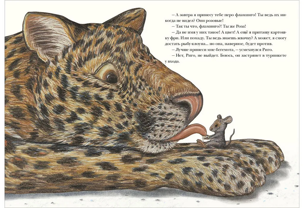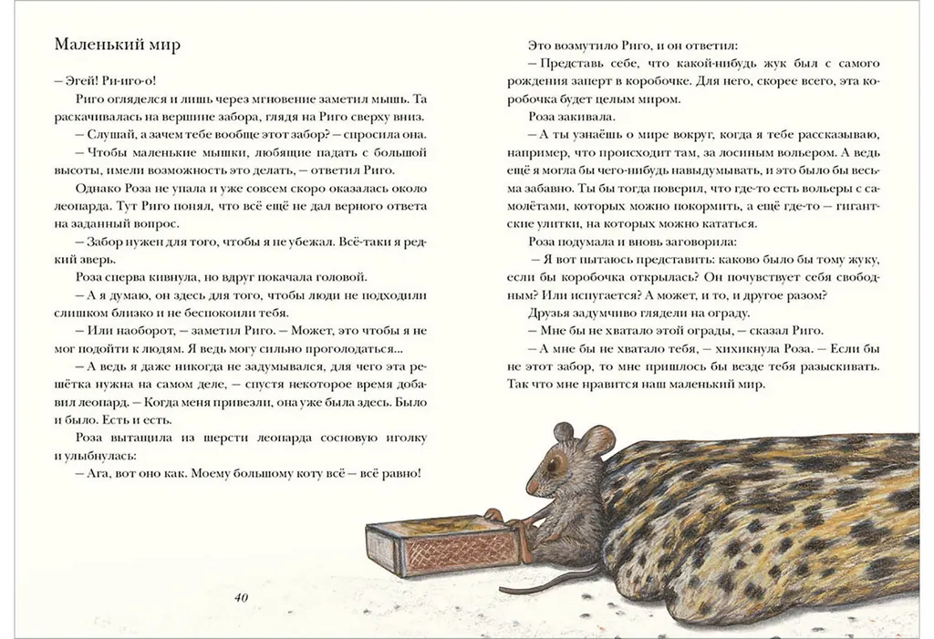 Леопард Риго и мышка Роза живут в зоопарке. Они большие друзья. Роза всегда может положиться на Риго, ведь старый леопард – отличный слушатель. А Риго наслаждается временем, проведённым рядом с Розой, – с тех пор, как она появилась в его жизни, мир каждый день кажется ему новым. Вместе они размышляют о стихах и картинах, о счастье и несчастье, о прыгающих деревьях и своевольных тенях и о многом, многом другом. Шутка и серьёзность в этих историях ходят рука об руку, как мышь с леопардом. Удивительные истории, неожиданные вопросы и необычные ответы ждут читателей в новых приключениях Риго и Розы.