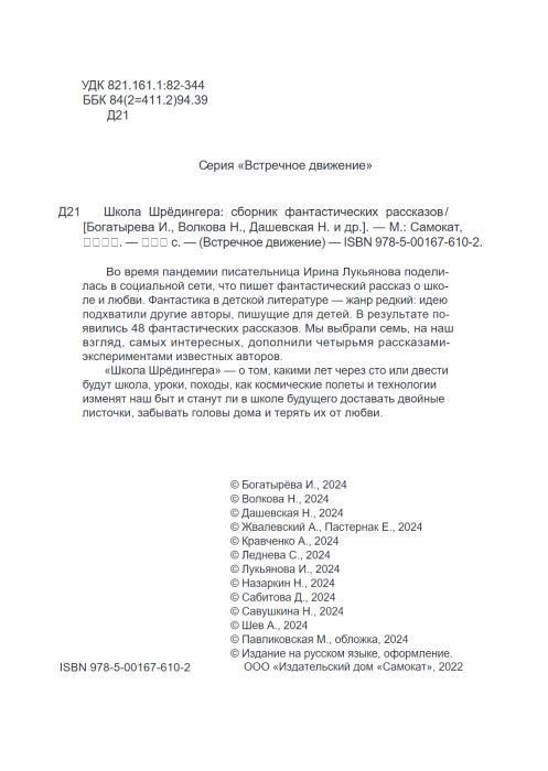 Во время пандемии писательница Ирина Лукьянова поделилась в социальной сети, что пишет фантастический рассказ о школе и любви. Фантастика в детской литературе — жанр редкий: идею подхватили другие авторы, пишущие для детей. В результате появилось 48 фантастических рассказов. Мы выбрали семь, на наш взгляд, самых интересных, дополнили четырьмя рассказами-экспериментами известных авторов. «Школа Шрёдингера» — о том, какими лет через сто или двести будут школа, уроки, походы, как космические полеты и технологии изменят наш быт и станут ли в школе будущего доставать двойные листочки, забывать головы дома и терять их от любви.