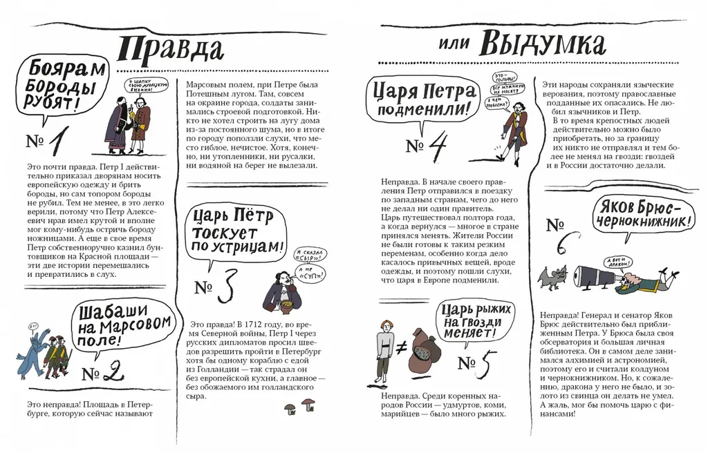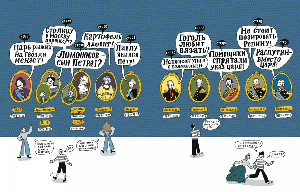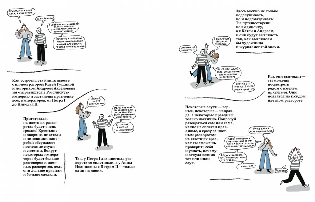 У иллюстратора Кати Гущиной и историка Андрея Аксёнова есть преимущество перед нашими предками — дистанция от той словесной суеты, которая позволяет спокойно восстановить историю, подтвердить или опровергнуть слухи о российских императорах от Петра I до Николая II.