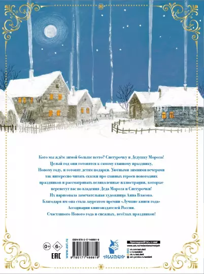 В книгу “Снегурочка. Зимние сказки” вошли четыре самые знаменитые, классические, новогодние сказки – “Снегурочка”, “Морозко”, “Два Мороза” и “Мороз Иванович”. Уютными зимними вечерами так интересно читать сказки про главных героев новогодних праздников и рассматривать великолепные иллюстрации, которые перенесут вас во владения Деда Мороза и Снегурочки! Счастливого Нового года и снежных, весёлых праздников. В этой книге удивительные иллюстрации, за которые художник Анна Власова стала лауреатом премии Ассоциации книгоиздателей России в 2022 году.