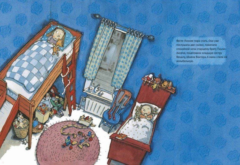 Туве Аппельгрен живет в Финляндии, но пишет по-шведски. Это первая книга в серии про девочку со странным именем Веста-Линнея и ее большую семью. «Спокойной ночи, Веста-Линнея!» — вторая книга из серии.