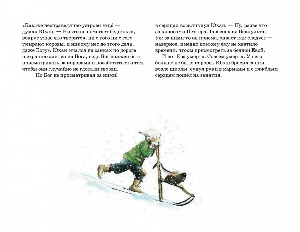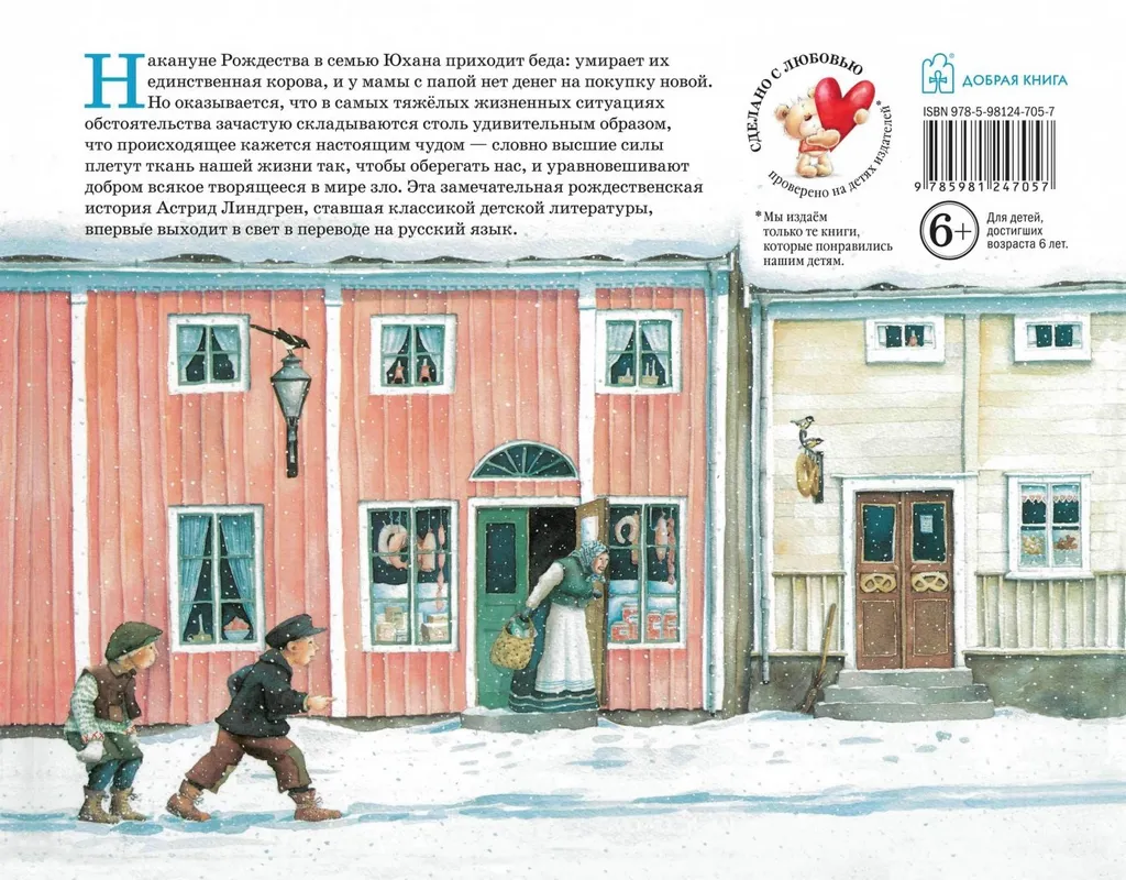 Накануне Рождества в семью Юхана приходит беда: умирает их единственная корова, и у мамы с папой нет денег на покупку новой. Но оказывается, что в самых тяжёлых жизненных ситуациях обстоятельства зачастую складываются столь удивительным образом, что происходящее кажется настоящим чудом – словно высшие силы плетут ткань нашей жизни так, чтобы оберегать нас, и уравновешивают добром всякое творящееся в мире зло. Эта замечательная рождественская история Астрид Линдгрен, ставшая классикой детской литературы, впервые выходит в свет в переводе на русский язык с великолепными иллюстрациями голландской художницы Марит Торнквист.
