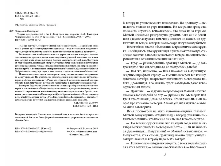 Виктория Ледерман в фантастических сюжетах разбирается не хуже своего героя, и новая повесть “Теория невероятностей” – прекрасный пример увлекательного, современного и ненавязчиво поучительного произведения. Предыдущие книги писательницы – “Календарь ма[й]я”, “Уроков не будет”, “Всего одиннадцать, или Шуры-муры в пятом “Д””, “К доске пойдёт… Василькин!” – стали бестселлерами среди читателей младшего и среднего школьного возраста.
