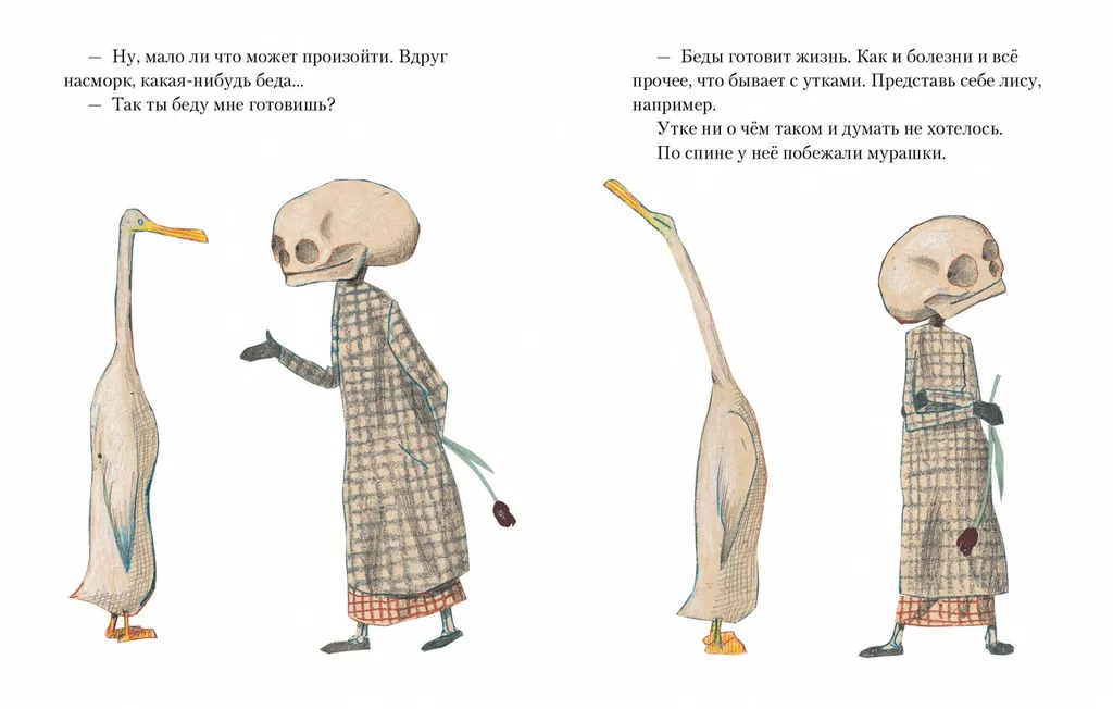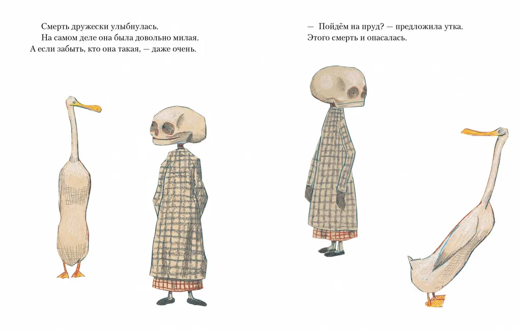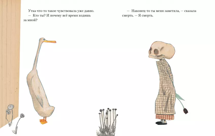 Оказывается, смерть была рядом с уткой всю жизнь, а утка и не подозревала. Но и со смертью вполне можно подружиться. Она приятный собеседник, хотя порой и уходит от ответа. Значит ли это, что есть вопросы, на которые каждый должен сам? Говорить о смерти непросто: Вольф Эрльбрух, немецкий автор-иллюстратор работал над этой книгой 10 лет. Теперь его философскую притчу знают и любят во всём мире. Эрльбрух, безусловно, один из самых известных немецких художников и авторов книг 20 века, обладатель престижных наград, в том числе премии Астрид Линдгрен и медали Андерсена. В своих книгах он не боится поднимать самые сложные вопросы, стирая границы между детской и взрослой литературой.