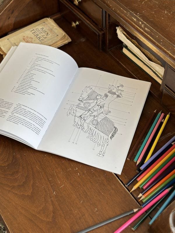Книга для раскрашивания «Военный костюм средневековой Европы» с рассказами о кольчужных и латных доспехах, которые защищали западноевропейских рыцарей и русских воинов в XII–XVII веках.