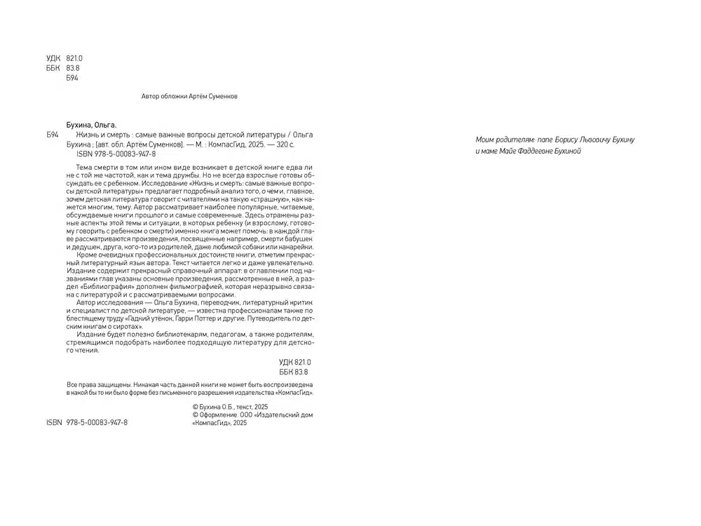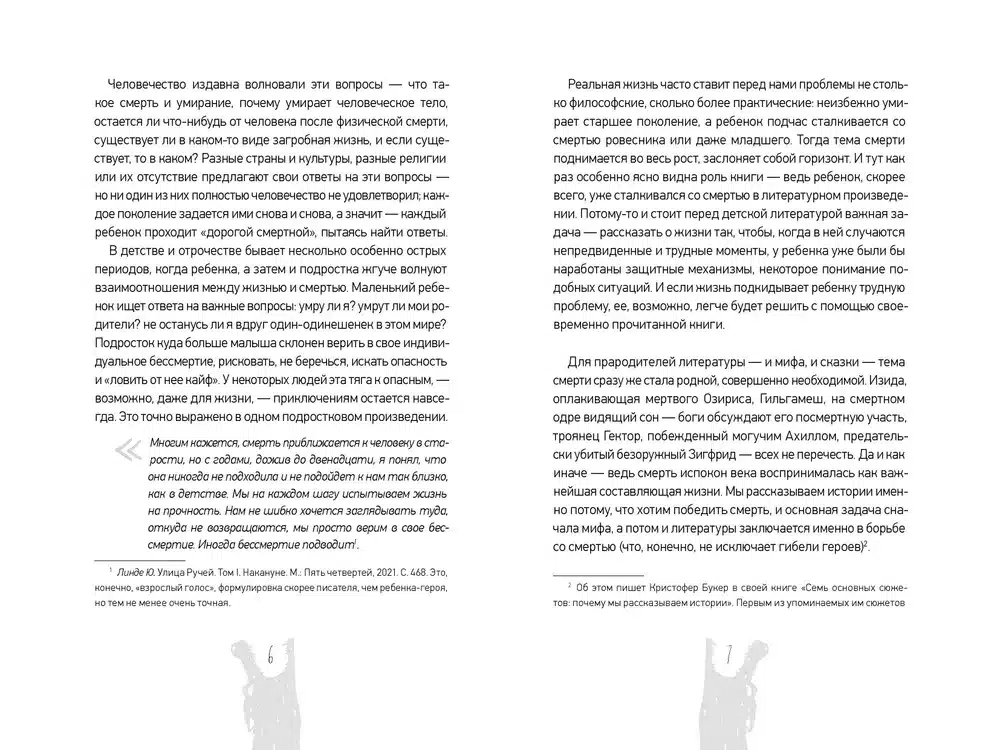 Тема смерти в том или ином виде возникает в детской книге едва ли не с той же частотой, как и тема дружбы. Но не всегда взрослые готовы обсуждать ее с ребенком. Исследование «Жизнь и смерть: самые важные вопросы детской литературы» предлагает подробный анализ того, о чем и, главное, зачем детская литература говорит с читателями на такую «страшную», как кажется многим, тему. Автор рассматривает наиболее популярные, читаемые, обсуждаемые книги прошлого и самые современные. Здесь отражены разные аспекты этой темы и ситуации, в которых ребенку (и взрослому, готовому говорить с ребенком о смерти) именно книга может помочь: в каждой главе рассматриваются произведения, посвященные, например, смерти бабушек и дедушек, друга, кого-то из родителей, даже любимой собаки или канарейки.